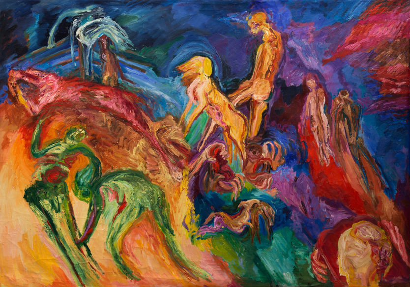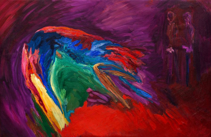 After her last exhibition “Último Refugio (Last Haven)”, the artist Fernanda Rodrigo, who lives and works in Buenos Aires, continued working in a series of paintings that she had begun before the quarantine, as a presentiment of a world that was no longer going to be the same. The bodies she painted, whether human or animal, appear to us undefined, disarmed, impossible, in a world where space has exploded. The use of color, textures and layers were acquiring an ever-greater preponderance, as if the density of a composition that builds unexpected relationships was accentuated with the charge of matter. Nothing was explained, there was no limit for those faceless figures. A lung and some raw bones.